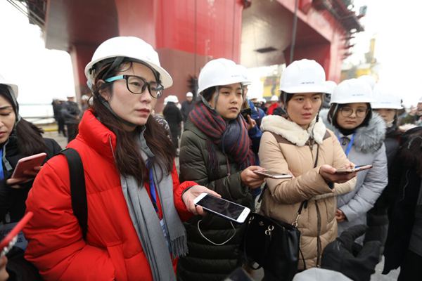 采访团记者在中集来福士进行采访。